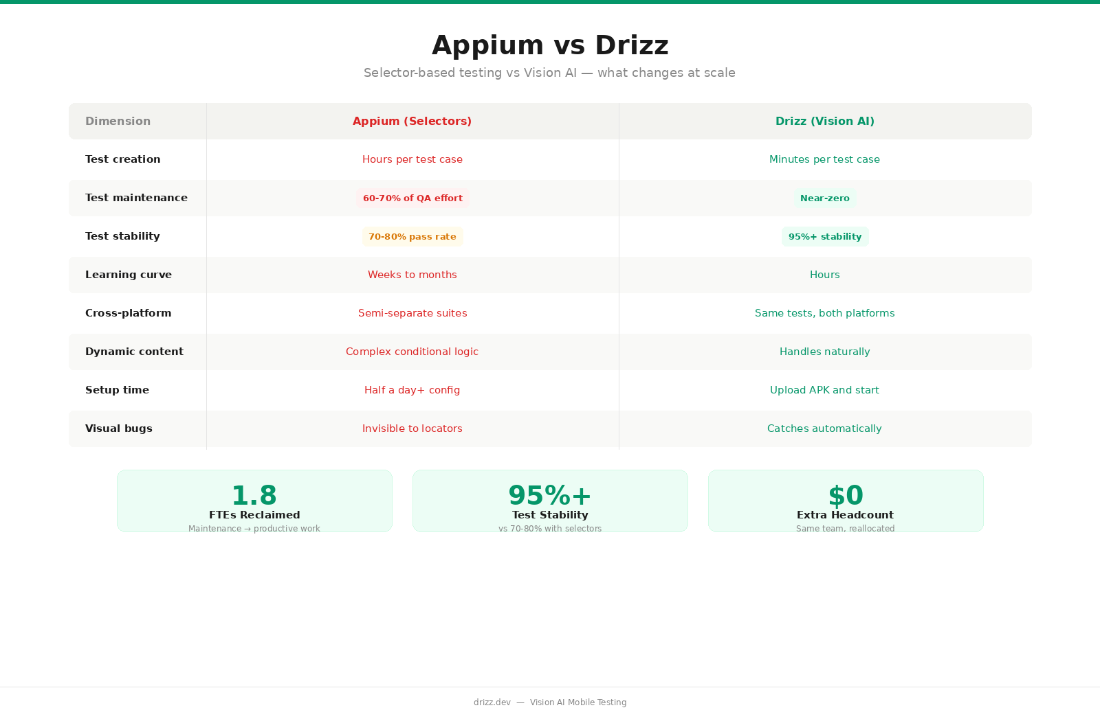 - With Appium: 3 QA engineers Ă— 60% maintenance = 1.8 FTEs spent fixing tests, not finding bugs.